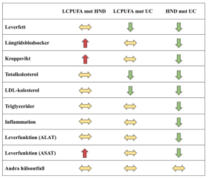Figur 3. Sammanfattning av effekterna i NAFLDiet-studien. Grön pil visar en statistiskt signifikant lägre nivå (exempelvis minskar leverfettet i LCPUFA-gruppen mer jämfört med UC), röd pil visar en statistiskt signifikant högre nivå (exempelvis är nivån av ASAT högre i LCPUFA-gruppen jämfört med HND), och gul pil visar att ingen statistiskt signifikant effekt finns.